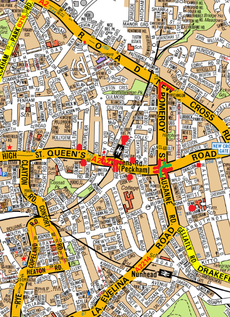 Between St.Queens road and Evelina road Two Way Area: Nunhead Station North LorR St.Queens road South LorR Evelina road Notes: Enter/Exit same - Rights okay from Main roads