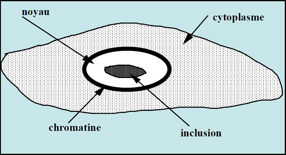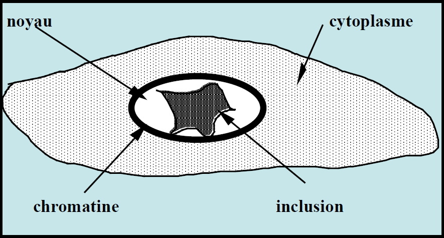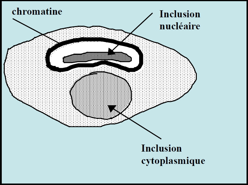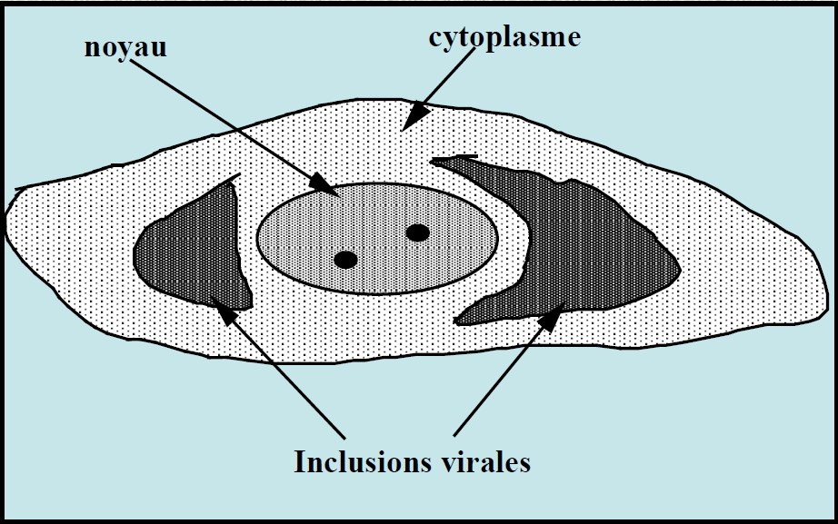 Virus qui se multiplient dans le noyau des cellules donnent à celles-ci un aspect arrondi, volumineux, avec au centre un noyau élargi et très réfringent. Il y a appartition de foyers de cellules arrondies.