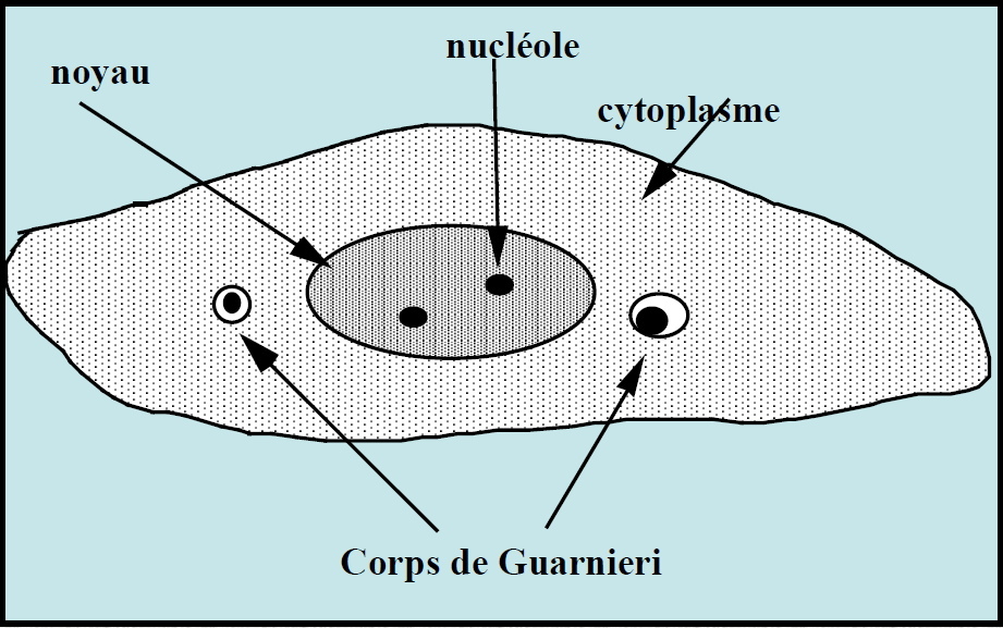 Petites inclusions intracytoplasmiques périnucléaires, inclusions entourées d’un halo clair (corps de Guarnieri)