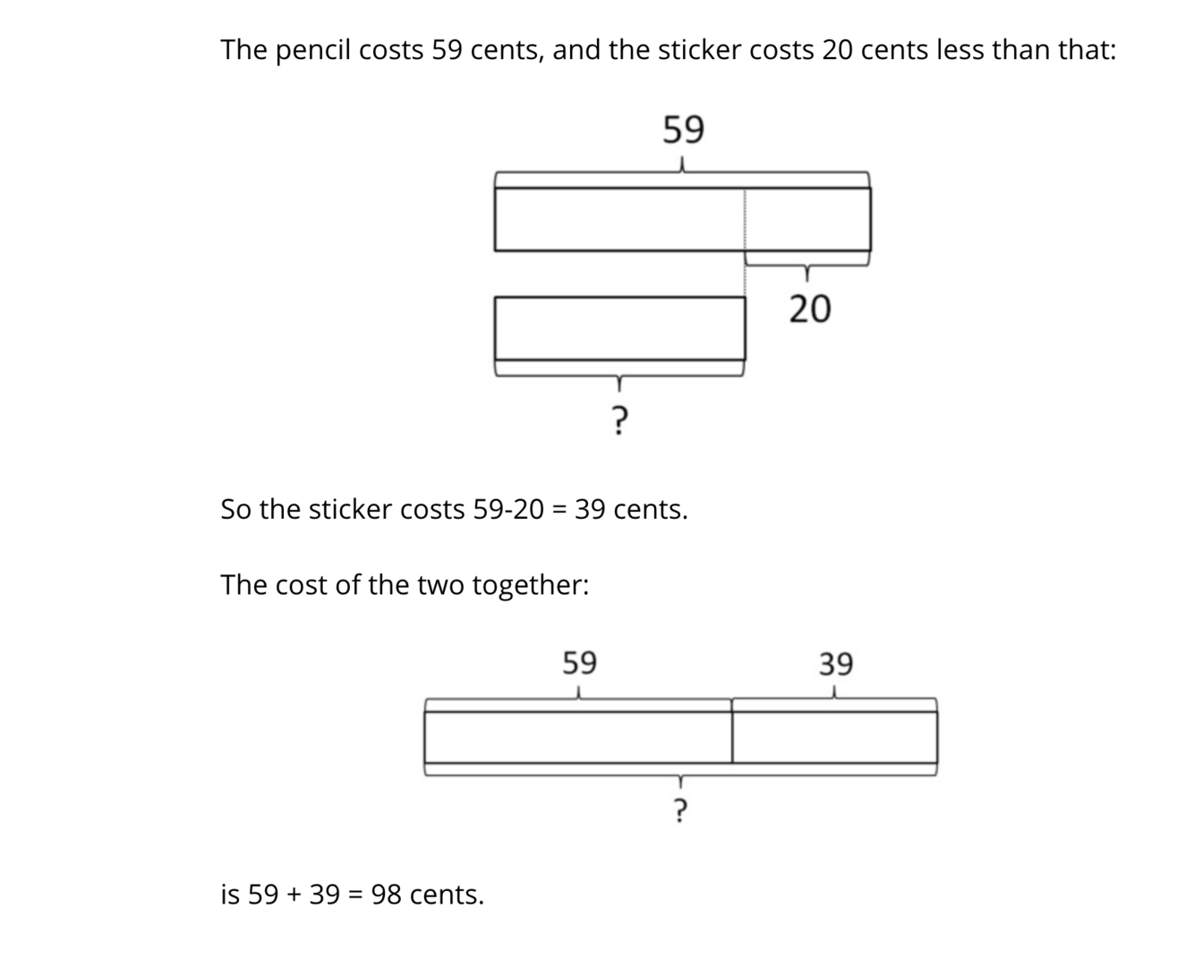 A pencil costs 59 cents, and a sticker costs 20 cents less. How much do a pencil and a sticker cost together?
