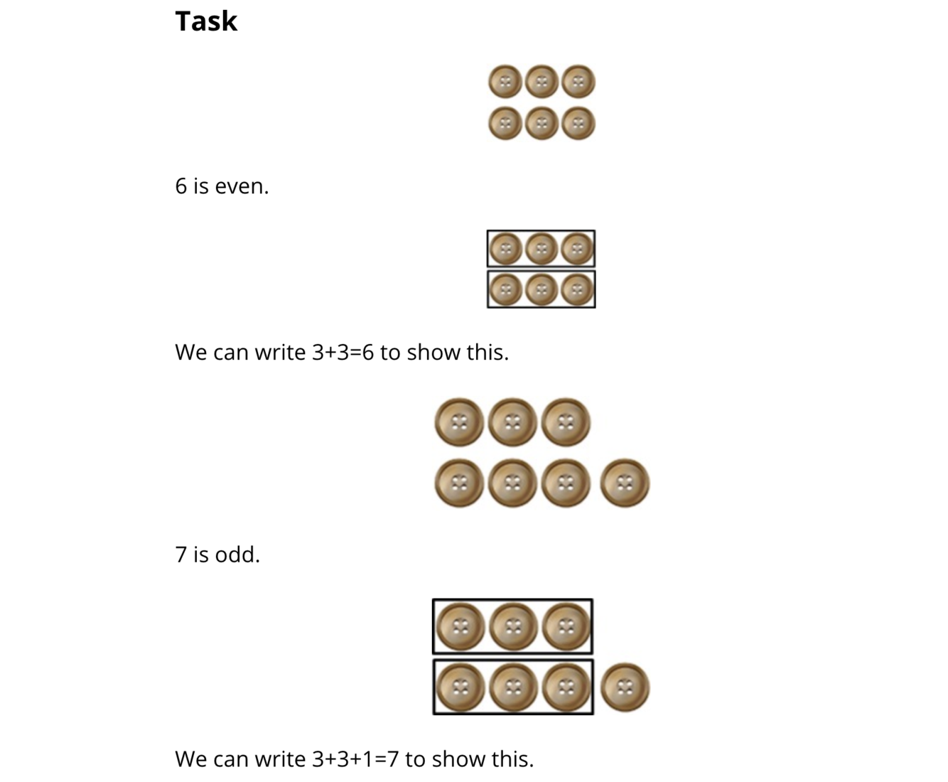 Take 8 buttons and count them by twos to determine if there is an even or odd amount. Write an equation showing if it is even or odd.