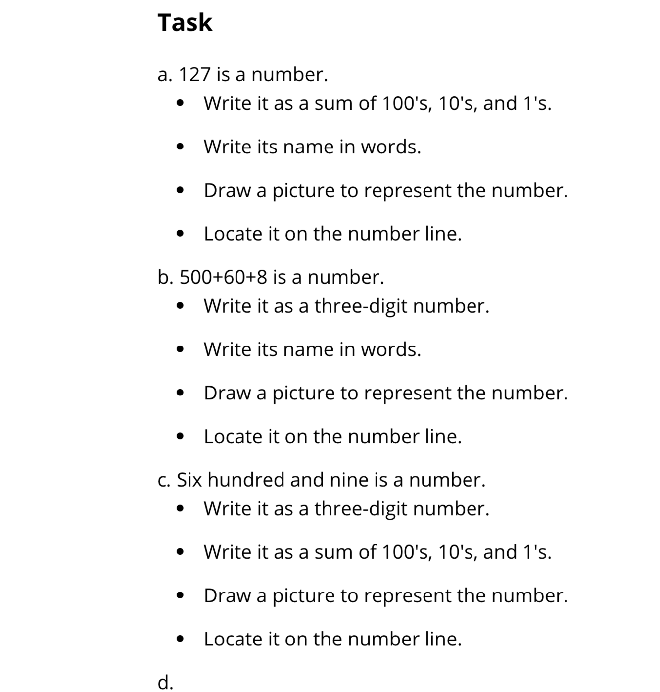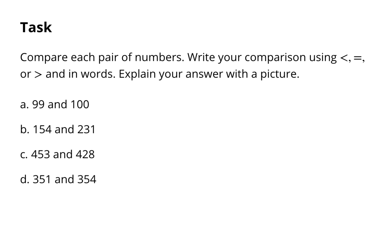 EX. https://tasks.illustrativemathematics.org/content-standards/2/NBT/A/4/tasks/1237