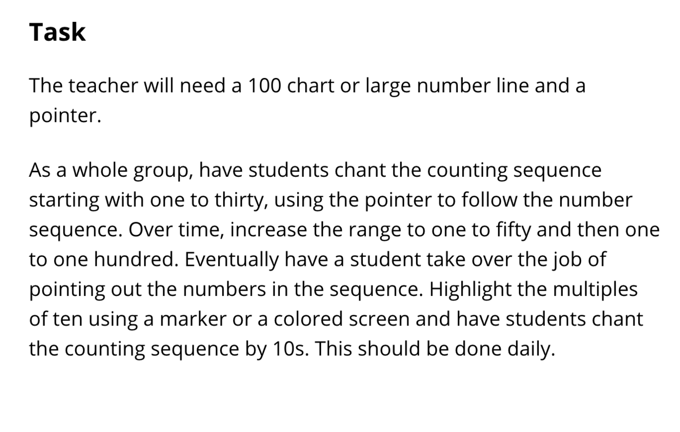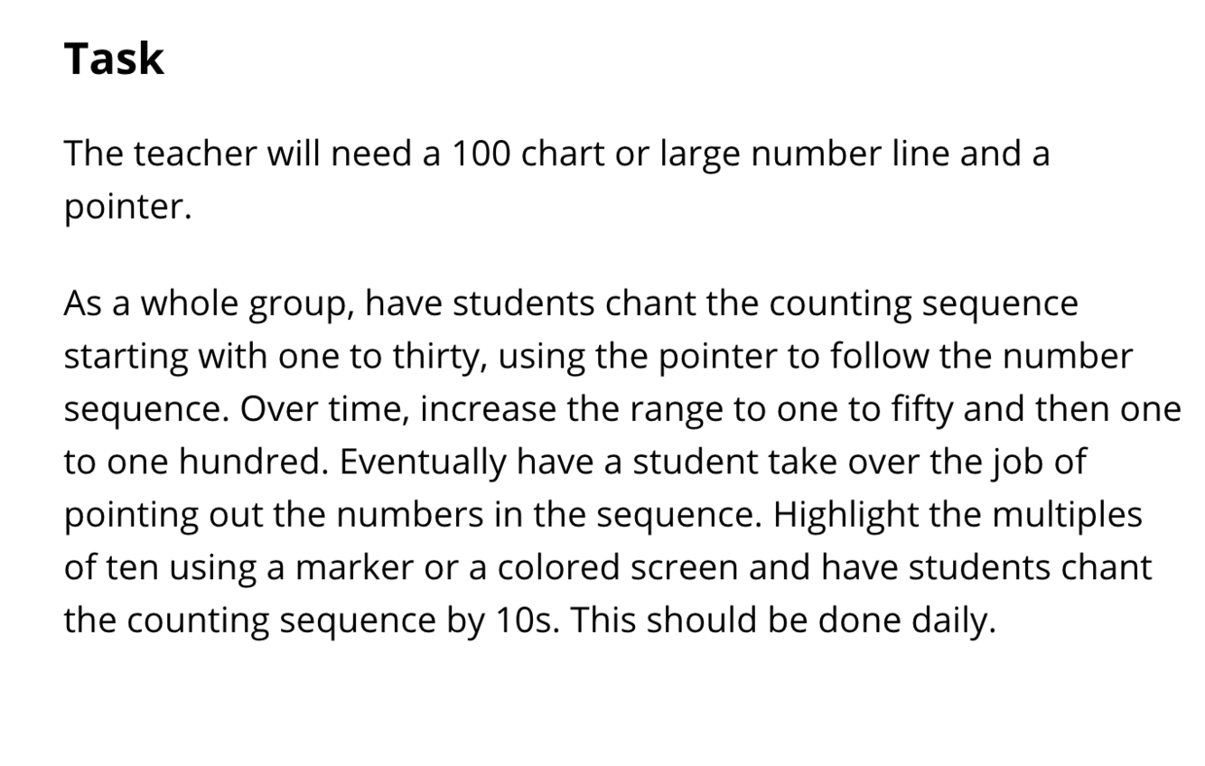 EX. https://tasks.illustrativemathematics.org/content-standards/K/CC/A/1/tasks/360