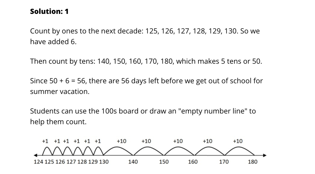 EX. Pose this problem to the children: We are in school 180 days. Today is the 124th day of school. How many more days until we are out of school for summer vacation? Explain how you know.