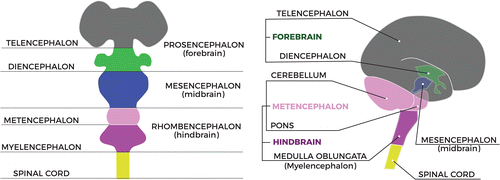 rostral end of the mesencephalon to the caudal end of the spinal cord.