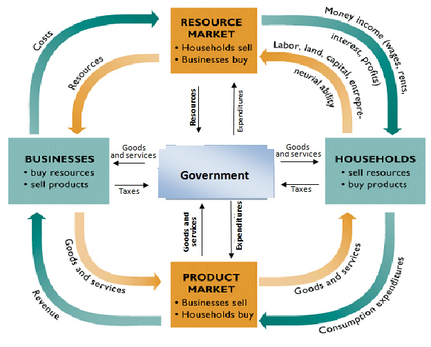-Government at the centre - 4 actors = resource market (top), product market (bottom) ,businesses (left), households (right)