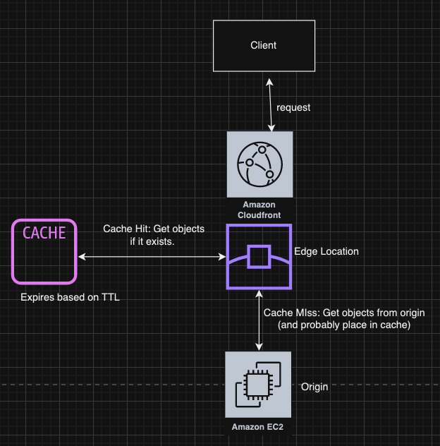 You have an app (UI and a backend) you’re serving on an EC2 instance. Sam is trying to some data to show up in the UI. Sam ends up first going to the nearest (depending on how you set things up) CloudFront (without them knowing, of course) Edge Location. Then the Edge Location checks out it’s (perhaps each Edge Location gets it’s own Cache? Things are getting fuzzy here) cache to see if the desired data is there. If it is, that’s a cache hit and the data goes back to fill in the user’s UI. If the desired data isn’t in the edge location cache, that’s a cache miss. The edge location reaches out to your Ec2 instance, gets the data, sticks a copy in the cache and returns a copy to Sam.