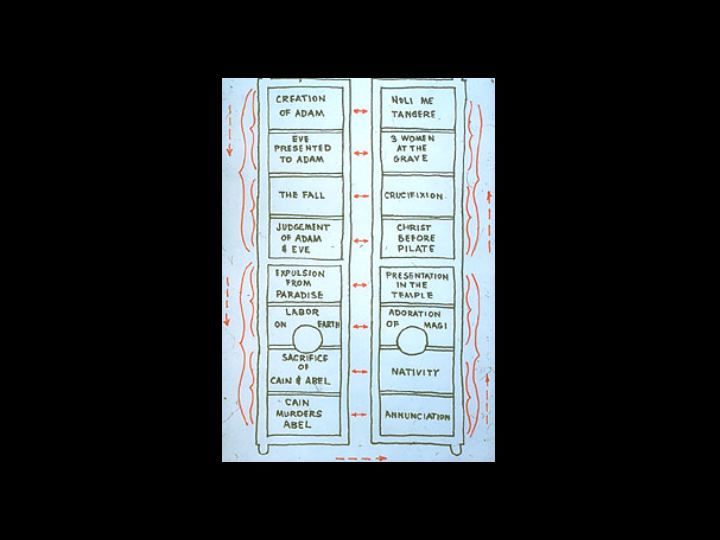 The iconography represents a series of correspondences that the Church saw between the Old and New Testaments