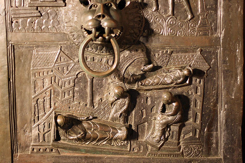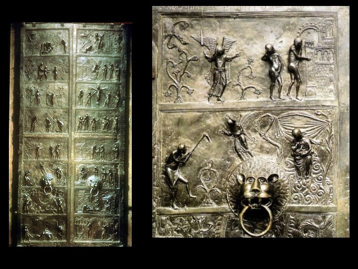 One of the best known scenes from the doors depicts God the Father accusing Adam and Eve of eating the forbidden fruit from the tree in the middle of the Garden of Eden