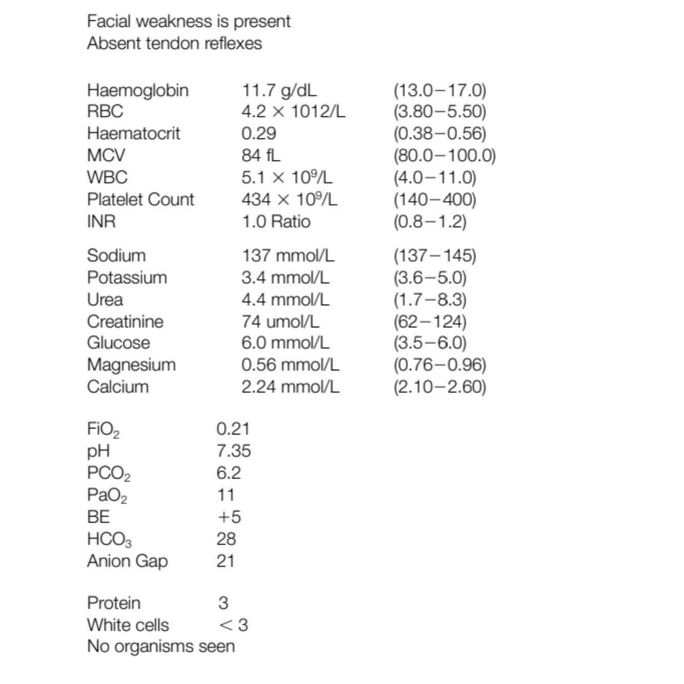He has been an inpatient for 10 days and was admitted with lethargy, unsteady feet, slurred speech, and general unwellness. Over the past 24 hours he has developed weakness in all four limbs and has started to drool saliva. His parents are Jehovah’s Witnesses.