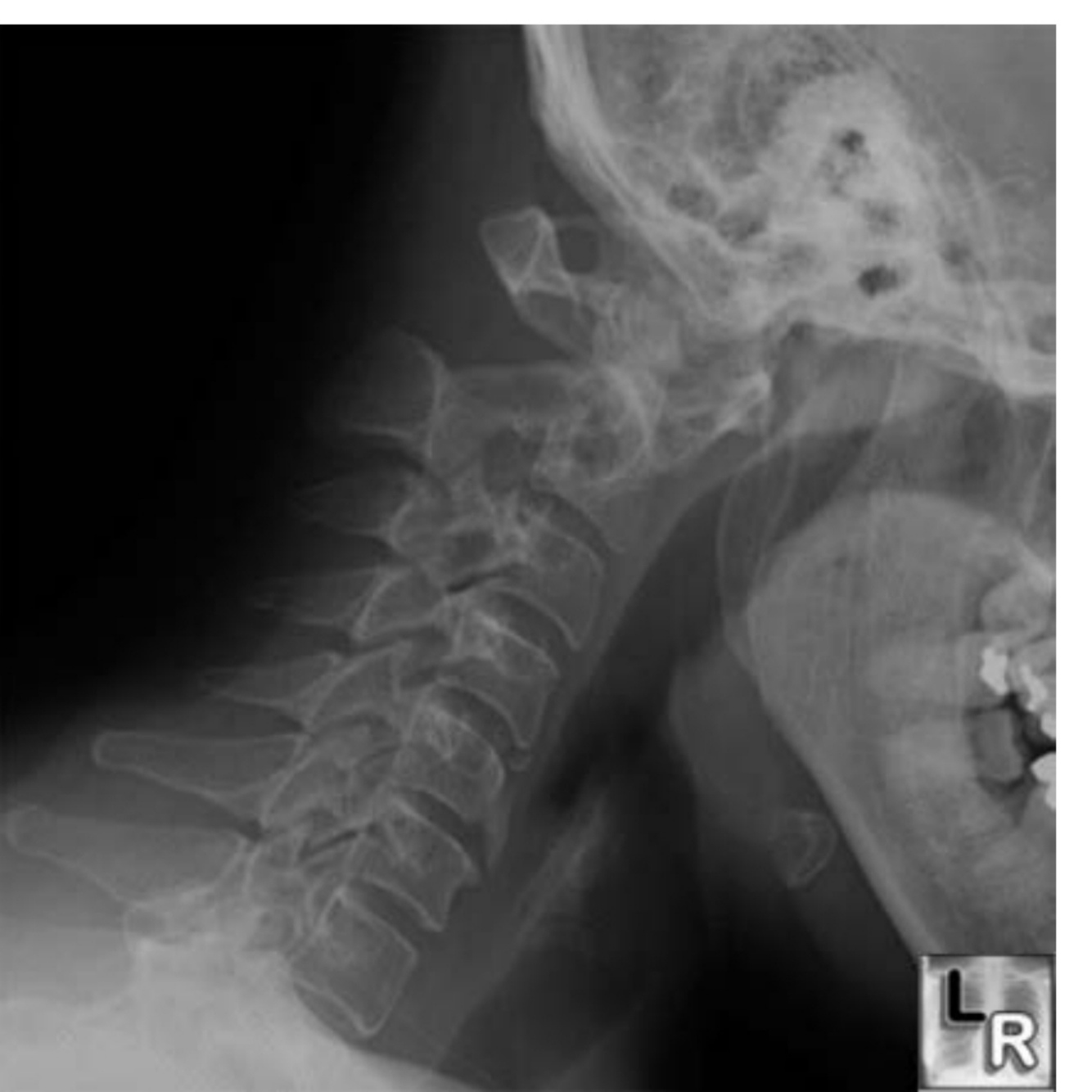 Lateral radiograph of the neck with the head in flexion shows an increased distance between the anterior border of the dens and the posterior border of the anterior tubercle of C1. This “pre-dentate space,” should be less than 3 mm in the adult. Also there is forward suluxation of C1 on C2.