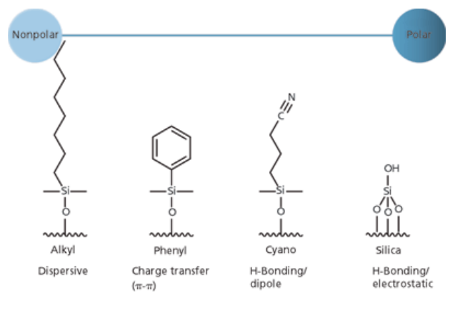 Altered selectivity can be achieved using cyano, phenyl and amino phases where dipole - dipole and pi, pi hydrogen bonding interactions can be utilised.