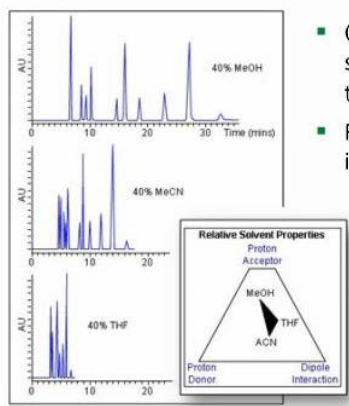 Changes in selectivity occur due to each solvents differing ability to undergo acid, basic and dipole interactions with analytes