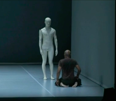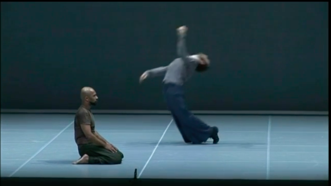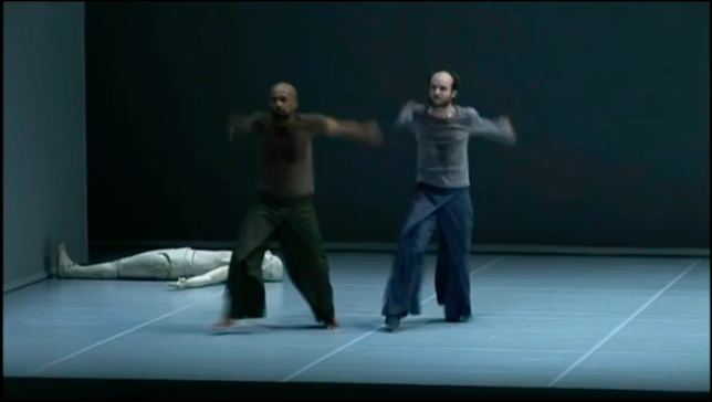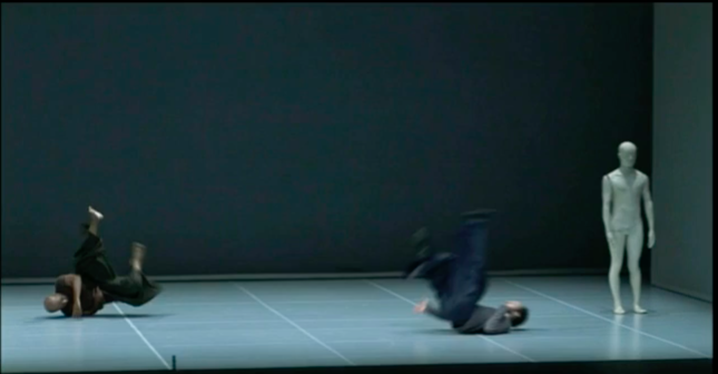 The aural setting is a sliding pitch by the strings from high to low and the music dance relationship is music visualisation. The dancers rock up with a feeling of suspension befoe falling to the floor in quite a natural way with a look of disorientation. As they fall they rock on to their shoulders.
