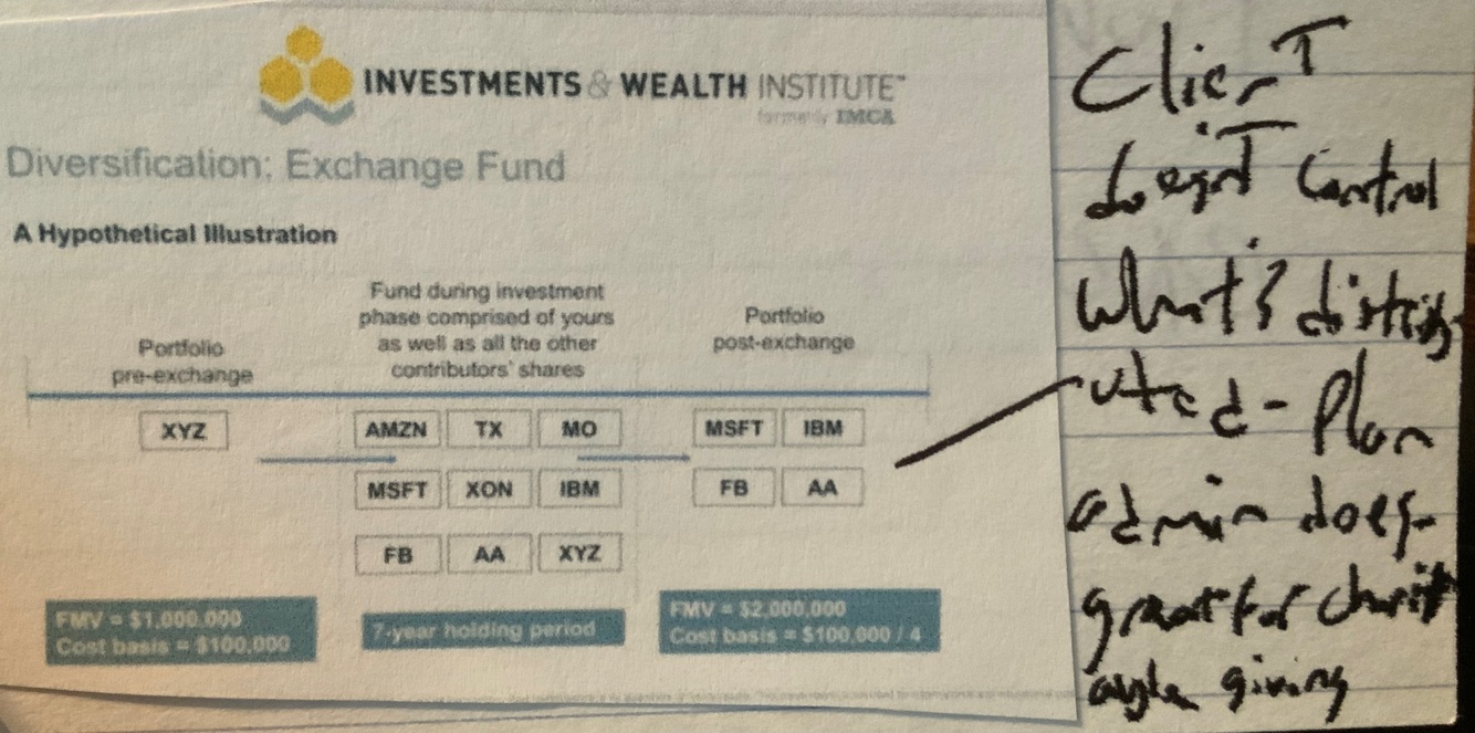 Exchange funds that allow qualified investors to pool shares into a partnership, with each investor receiving a pro- rata share of the fund. There is no immediate tax liability. The downside is they have limited liquidity due to the lock-up period of seven years.