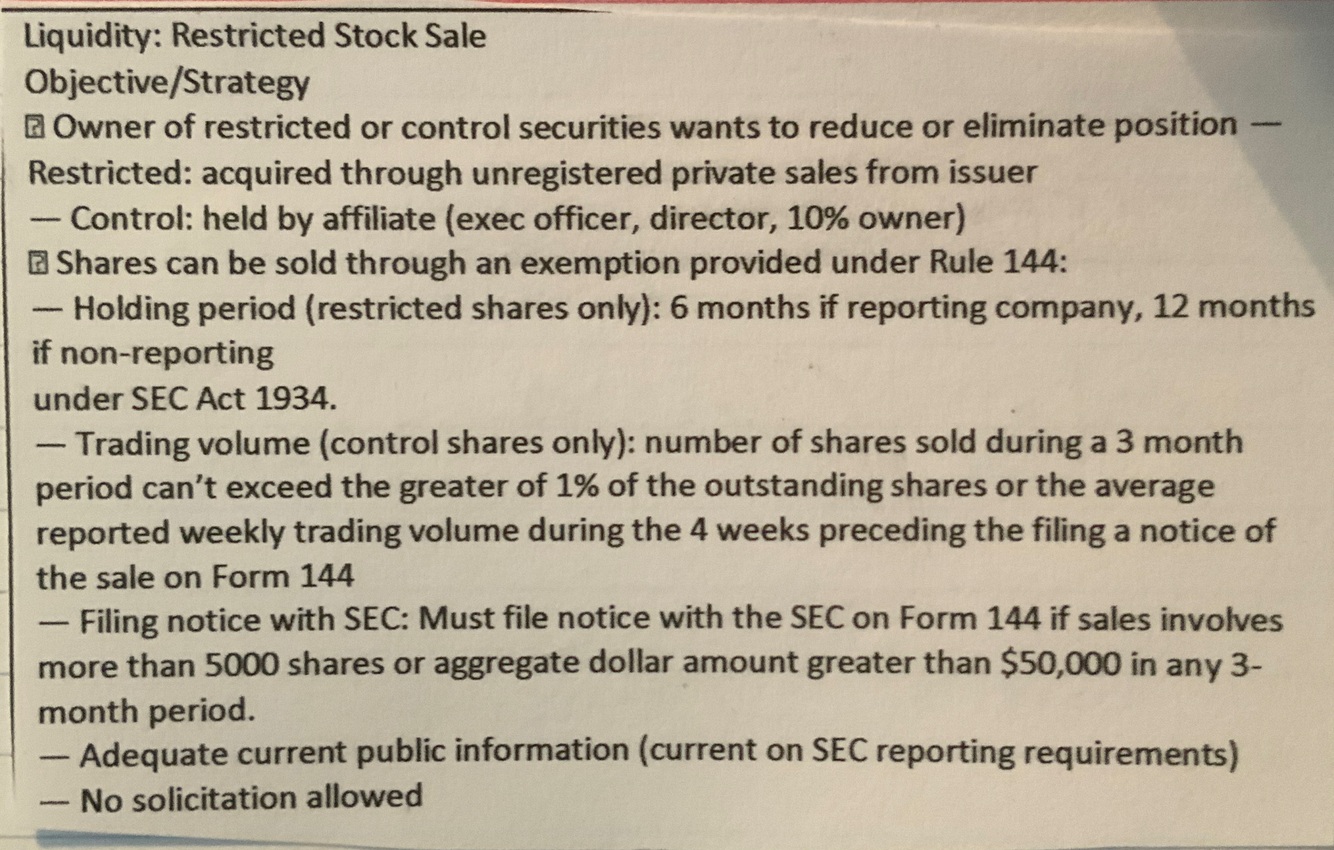 The # of shares sold in any 3 month period is limited to 1% of outstanding shares and average weekly volume during previous 4 weeks