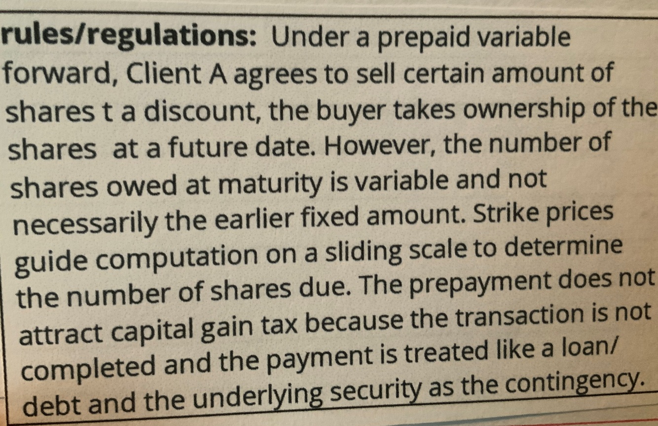 Prepaid variable forward in which shares are sold at a future date in exchange for cash advance at the present date. This method provides immediate liquidity from the cash advance and deferral of capital gains.