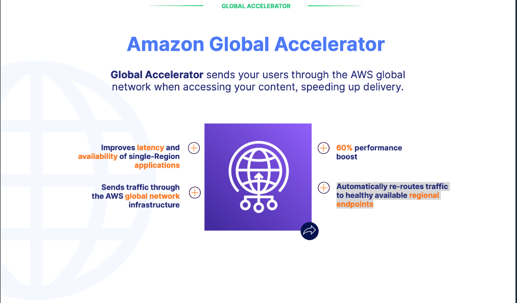 Global Accelerator sends your users through the AWS global network when accessing your content, speeding up delivery.