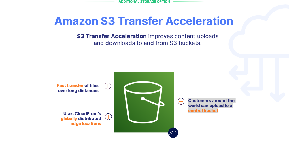 S3 Transfer Acceleration improves content uploads and downloads to and from S3 buckets.