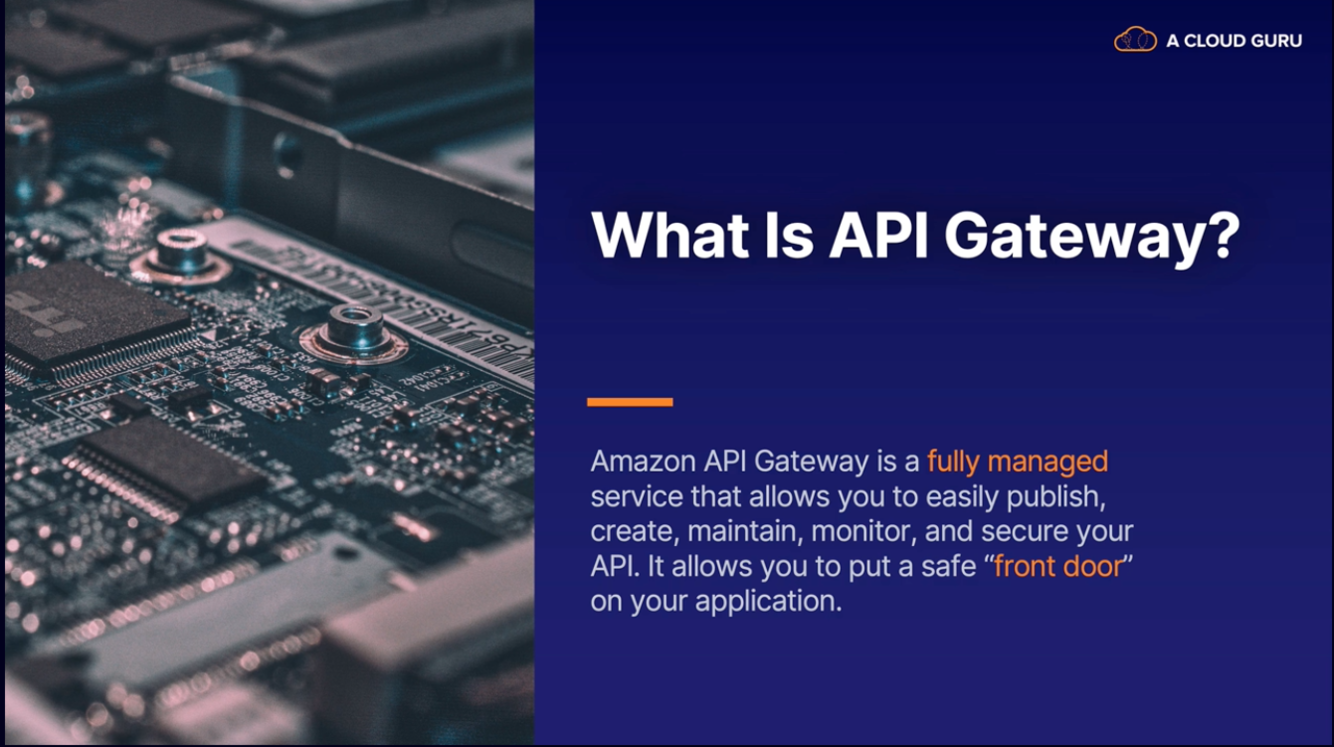 • Amazon API Gateway is fully managed service that allows you to publish, create, maintain, monitor and secure your API. It allows you to put a safe “Front door” on your application.
