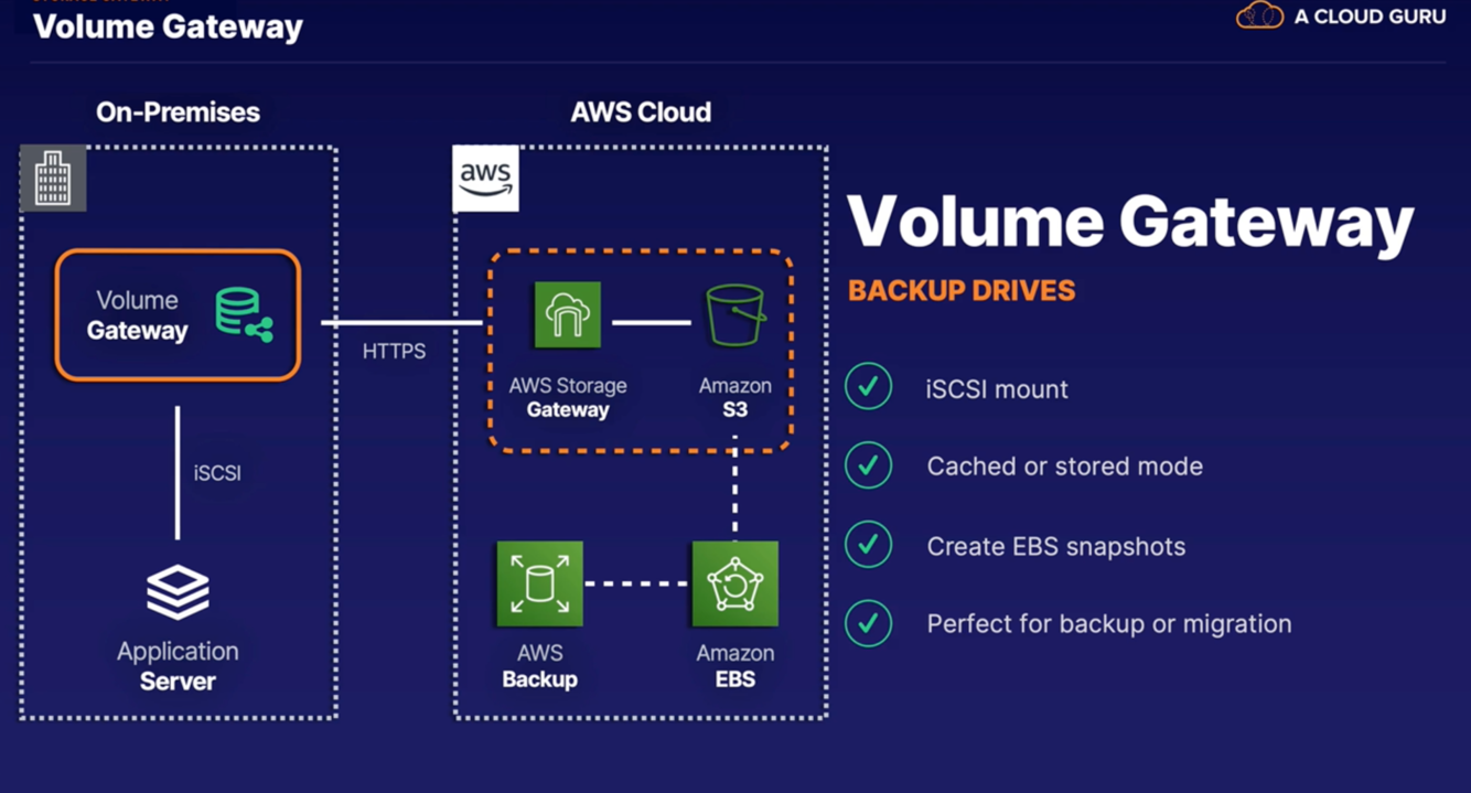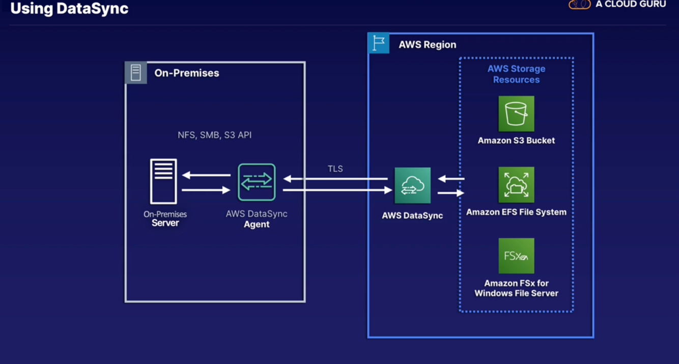 • ExamTip: DataSync is for a one-time migration. use Storage Gateway for continous sync.