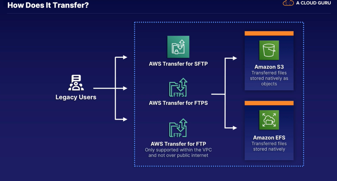 • The AWS Transfer Family allows you to easily move files in and out of S3 or EFS using Secure File Transfer Protocol (SFTP), File Transfer Protocol over SSL (FTPS), or the File Transfer Protocol (FTP)