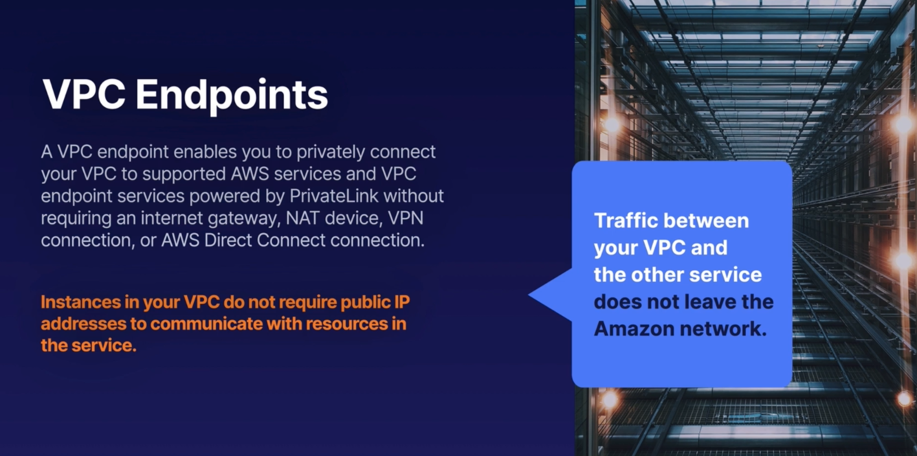 A VPC endpoint enables you to privately connect your VPC to supported AWS services and VPC endpoint services powered by PrivateLink without requiring an internet gateway, NAT device, VPN connection or AWS Direct Connect connection.