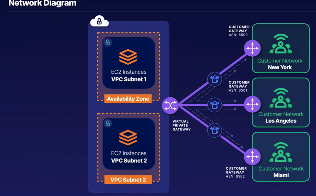 • It operates over the public internet, but all the traffic between the customer gateway and the AWS VPN CloudHub is encrypted.
