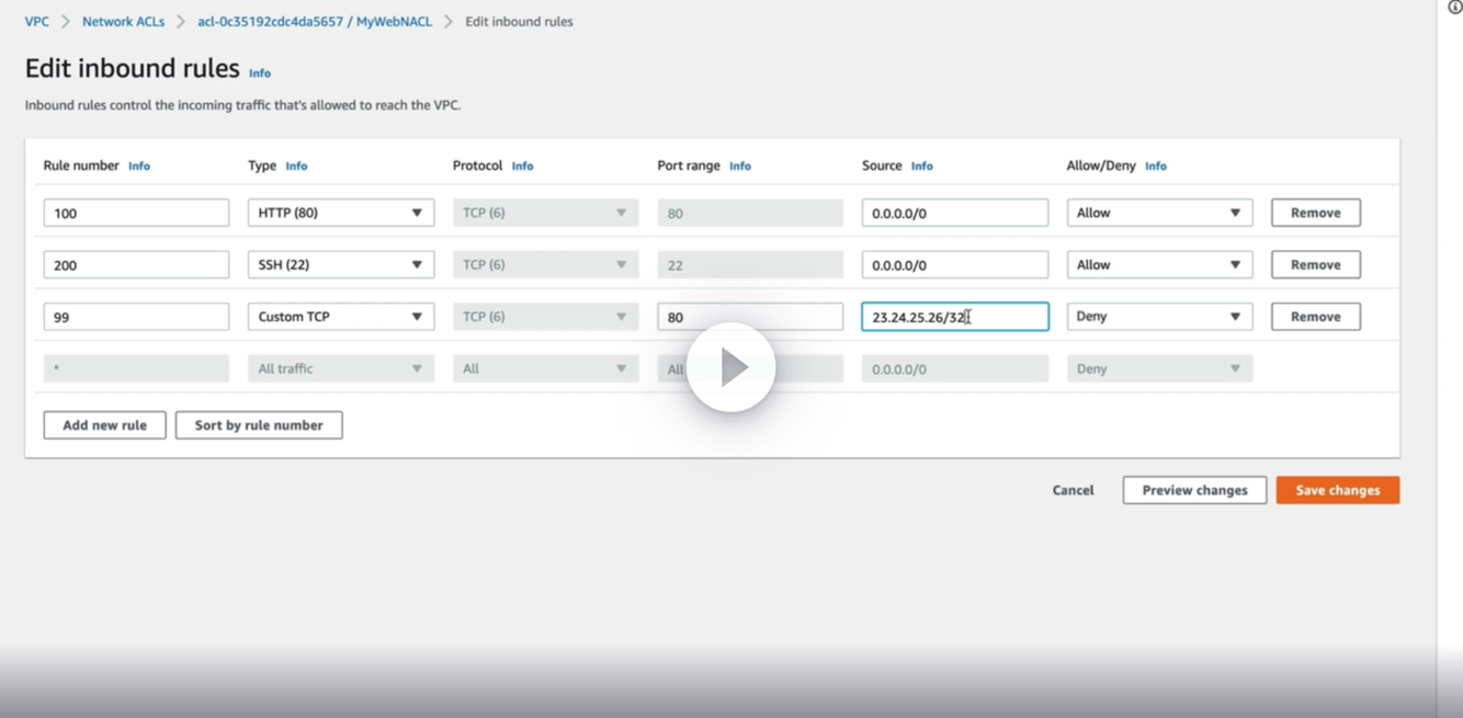 In practice, to cover the different types of clients that might initiate traffic to public-facing instances in your VPC, you can open ephemeral ports 1024-65535. However, you can also add rules to the ACL to deny traffic on any malicious ports within that range. Ensure that you place the deny rules earlier in the table than theallow rules that open the wide range of ephemeral ports.