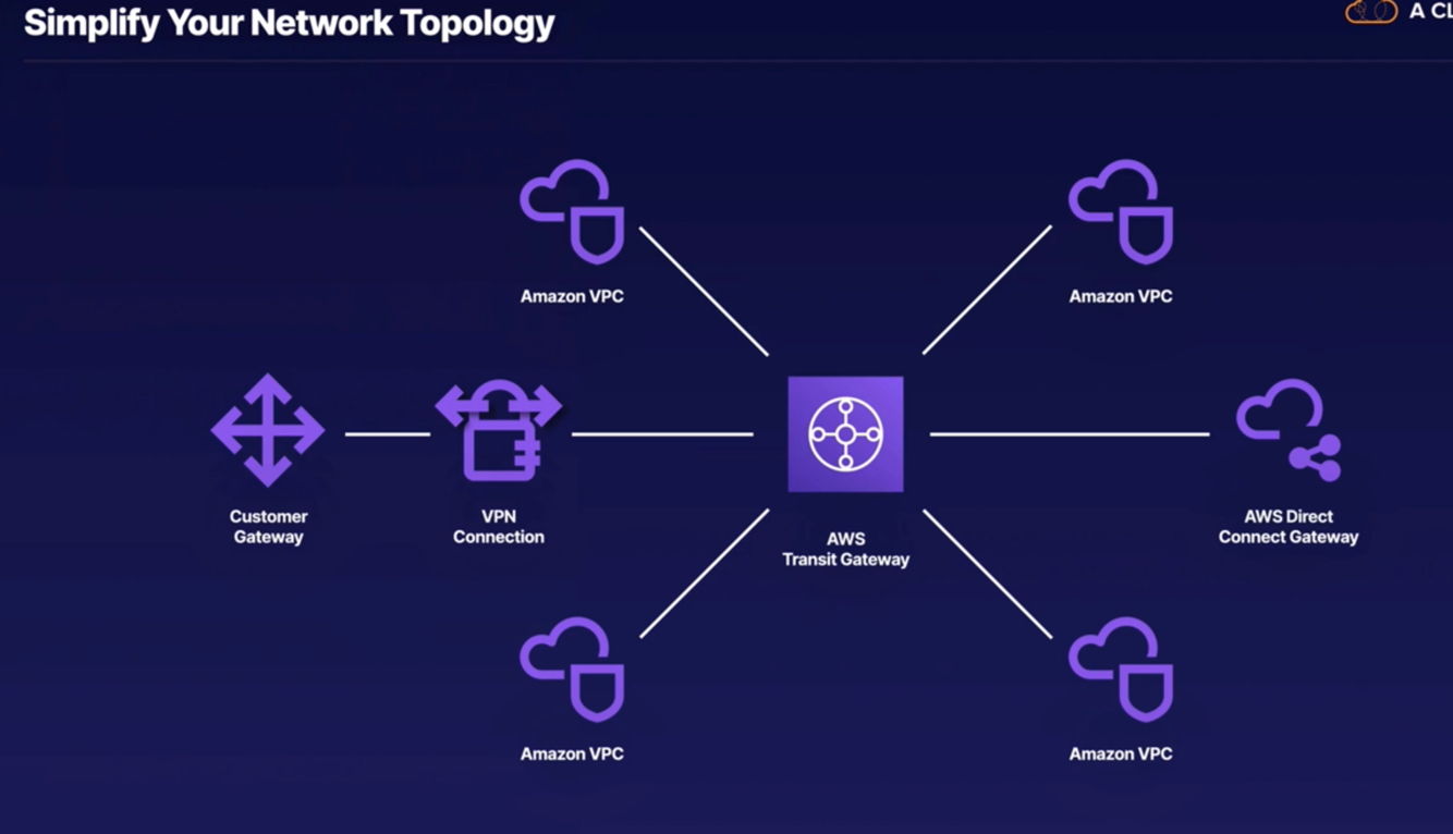 AWS Transit Gateway connects VPCs and on-premises networks through a central hub. This simplifies your network and puts an end to complex peering relationships. It acts as a cloud router - each connection is only made once.