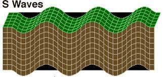 S waves are shear waves that are slower than P waves. The motion is perpendicular to the direction of the wave travel, similar to the motion of vigorously shaking a rope. They can only move through solids