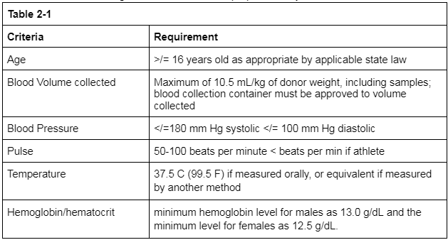 Requirements for donor eligibility to donate whole blood are set forth in AABB Standards for Blood Banks and Transfusion Services (Standards). See Table 2-1.