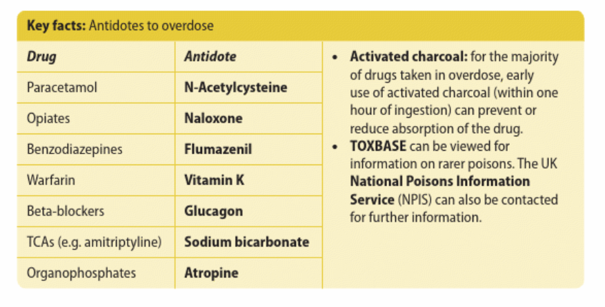State the antidotes for following drugs that are commonly used to overdose: