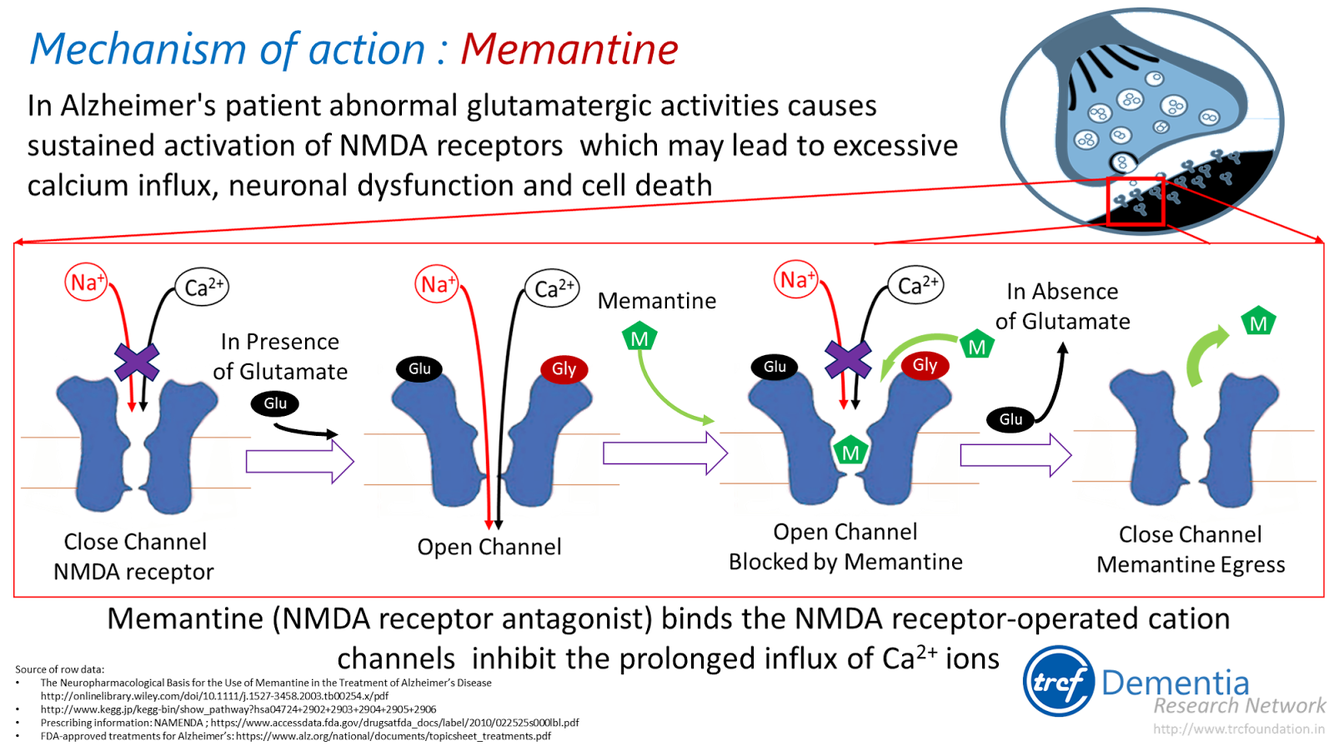 open channel receptor block of NMDA channels to prevent Ca+2 influx, reduce excitotoxicity, treatment for Alzheimer’s