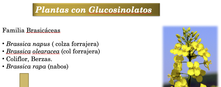 Principios tóxicos y mecanismos de acción: los principios tóxicos son los GLUCOSINOLATOS (glucósidos azufrados) que producen numerosos efectos fisiológicos y que en exceso resultan antinutritivos o tóxicos.