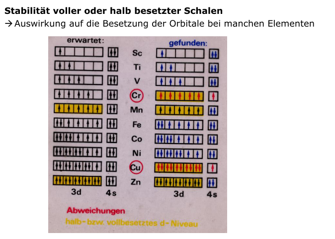 Nenne Bsp. bei welchen Elementen die Stabilität voller oder halb besetzter Schalen Auswirkung auf die Besetzung der Orbitale hat.