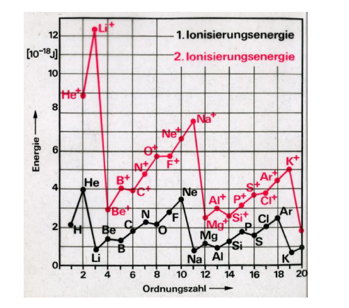 → Bei K+ müsste die stabile Edelgaskonfiguration zerstört werden, um zum K2+ zu kommen.