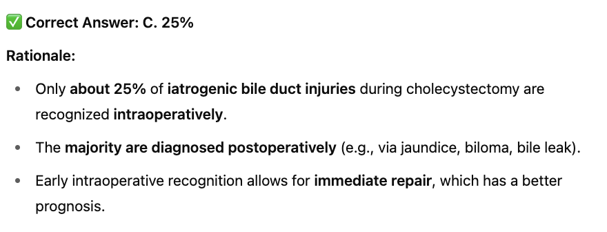 What percentage of bile duct injuries are identified intraoperatively?