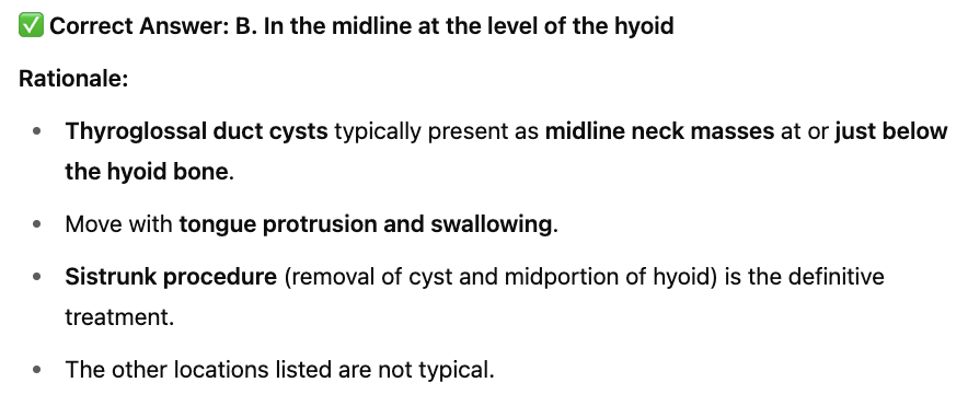B. In the midline at the level of the hyoid