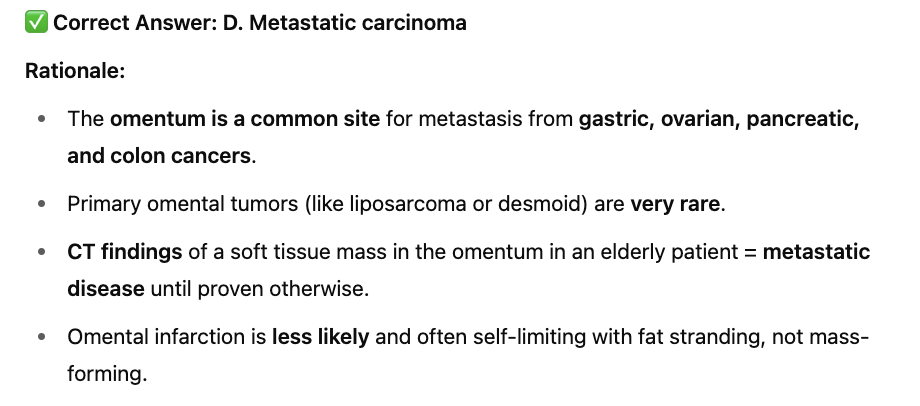 A 60-year-old woman presents with abdominal pain. A CT scan reveals an omental mass. The most likely diagnosis is: