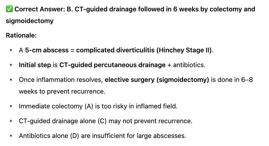 B. CT-guided drainage followed in 6 weeks by colectomy and sigmoidectomy