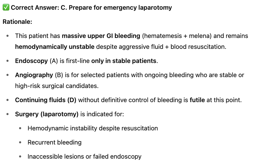 A 50-year-old male with a history of peptic ulcer disease presents with hematemesis and melena. After aggressive resuscitation (3L crystalloids + 3L blood) over 6-8 hours, he remains hypotensive (BP 80/60, PR 140). What is the next best step?