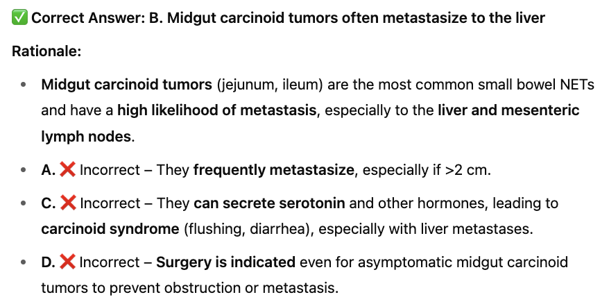 B. Midgut carcinoid tumors often metastasize to the liver