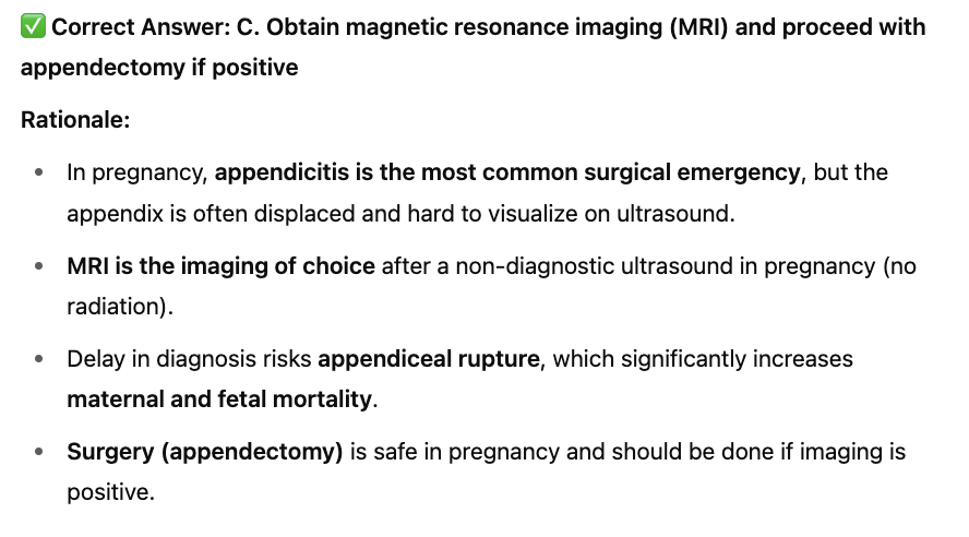 C. Obtain magnetic resonance imaging (MRI) and proceed with appendectomy if positive