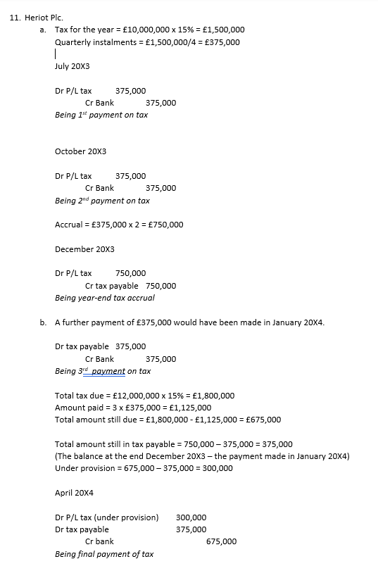 Herriot Plc. are a larger company which pay tax in quarterly instalments. The tax rate in force is 15%.