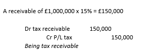Dundas Ltd. have made a taxable loss of £1,000,000 for the year. The tax rate in force is 15%. Dundas’s accountant is confident that they will receive a refund from the tax authorities. Prepare the journal to account for this.