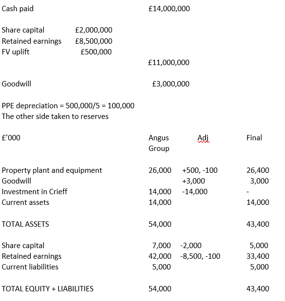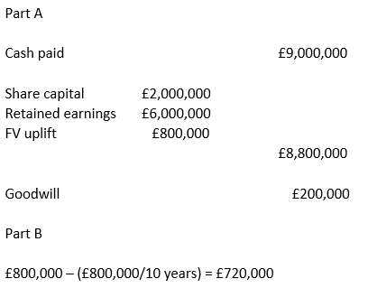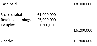 Maclean Ltd. has acquired Harper Ltd. for £9,000,000. At the point of acquisition Harper had share capital of £2,000,000, retained earnings of £6,000,000 and PPE with a value of £4,000,000. All the assets at acquisition were held at their carrying value with the exception of PPE which are considered to be worth £800,000 more than their carrying amount. These items of PPE have a useful life of 10 years.