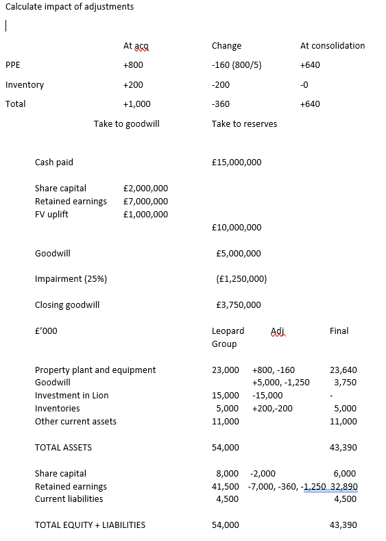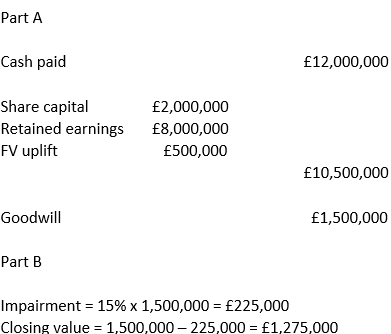 Leeds Ltd. has acquired Bradford Ltd. for £12,000,000. At the point of acquisition Bradford had share capital of £2,000,000 and retained earnings of £8,000,000. All the assets at acquisition were held at their carrying value with the exception of inventory which is considered to be worth £500,000 more than their carrying amount. At the year-end goodwill is considered to be 15% impaired.