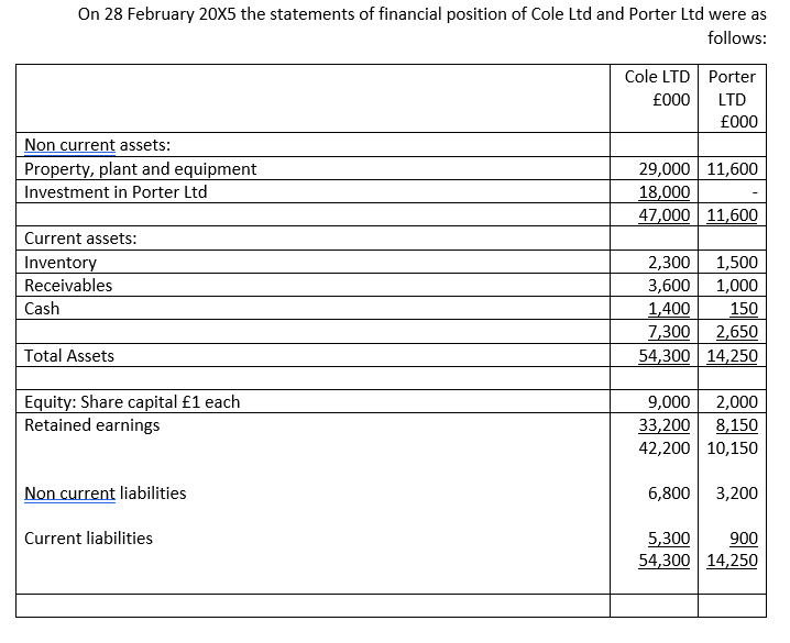 On 1 March 20X4 Cole Ltd purchased a 100% shareholding in Porter Ltd for £18m in cash. Porter’s retained earnings at 1 March 20X4 were £7.5 million. Neither company paid dividends during the year.