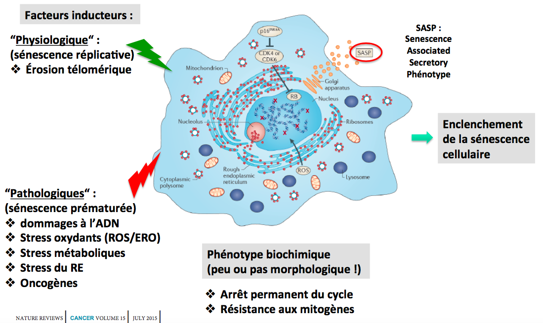 Une cellule sénescente est incapable de ré-entrer dans le cycle cellulaire même en présence de facteurs mitogènes ou d’oncogènes.